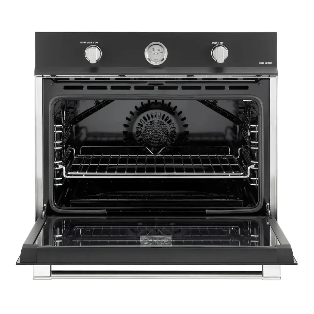 Verona 30 inch built-in gas single wall oven provides a commercial design and performance for your kitchen. The convection fan circulates air within the oven for even heat distribution. The temperature gauge and stainless steel round handle add style to the oven.